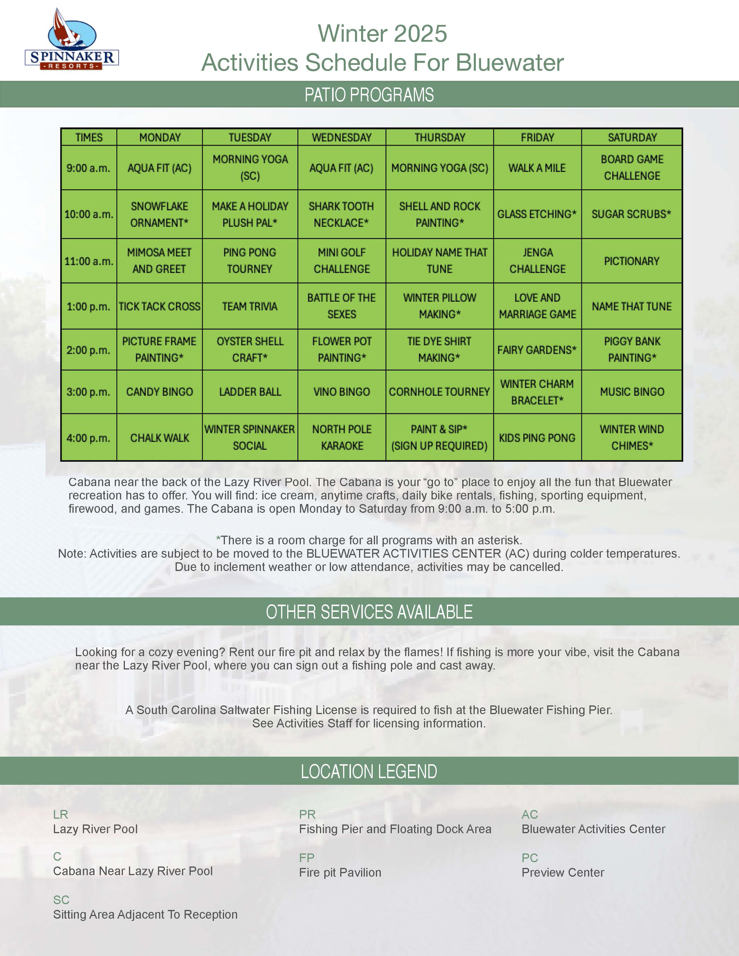 Please contact a member of the Activities staff at the Recreation Cabana for fishing and crabbing gear for rent and fishing bait for sale.